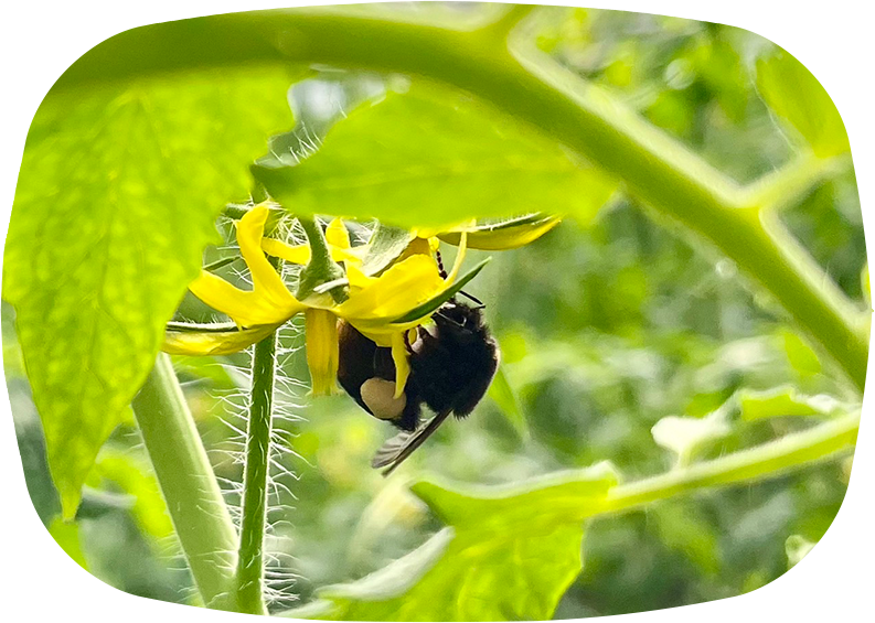蜂が受粉したトマトは、着果が安定する上に、身がぎっしり詰まり、より濃厚な味わいになると言われています。また、蜂が元気に飛び交う環境は、低農薬の証でもあります。